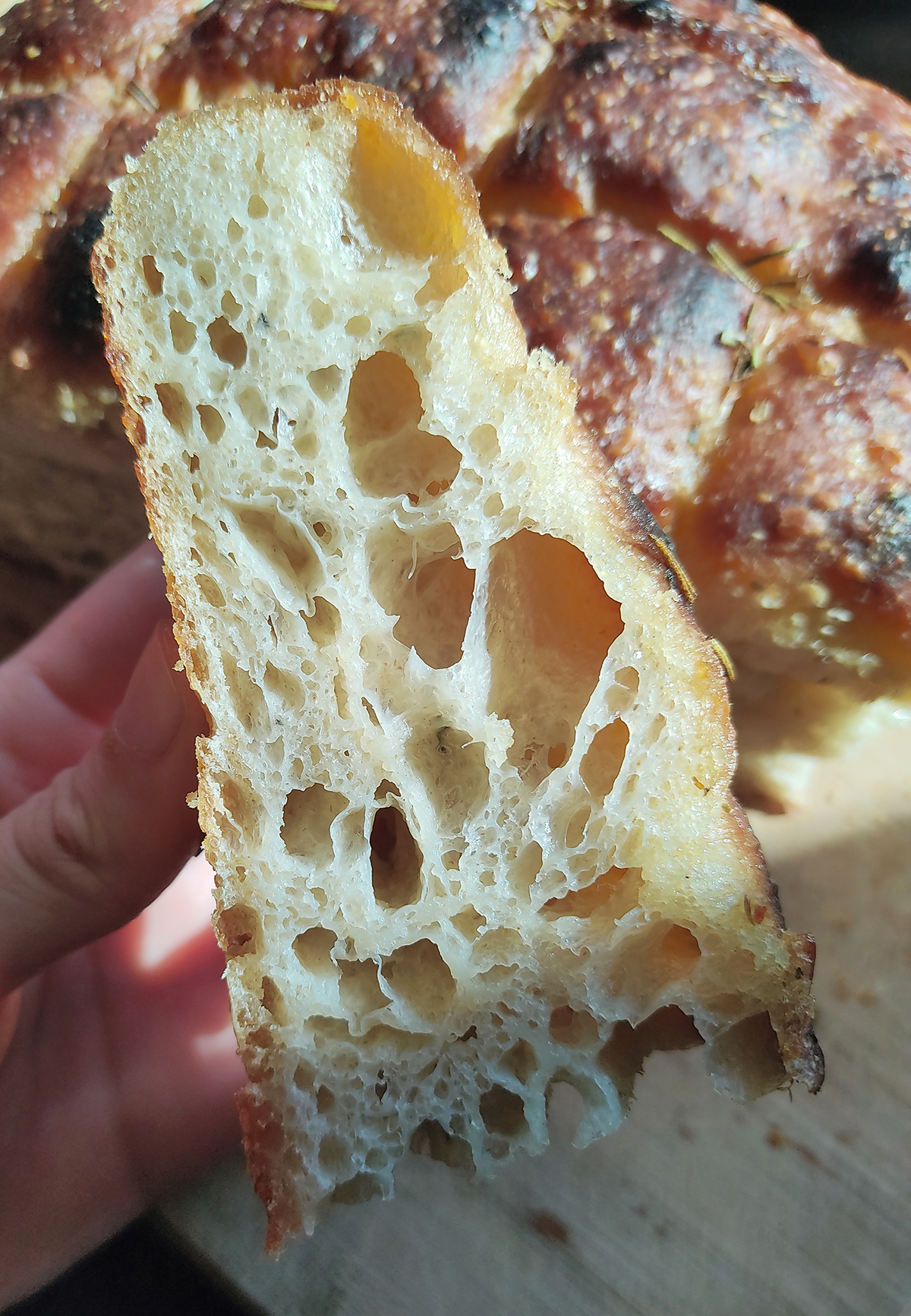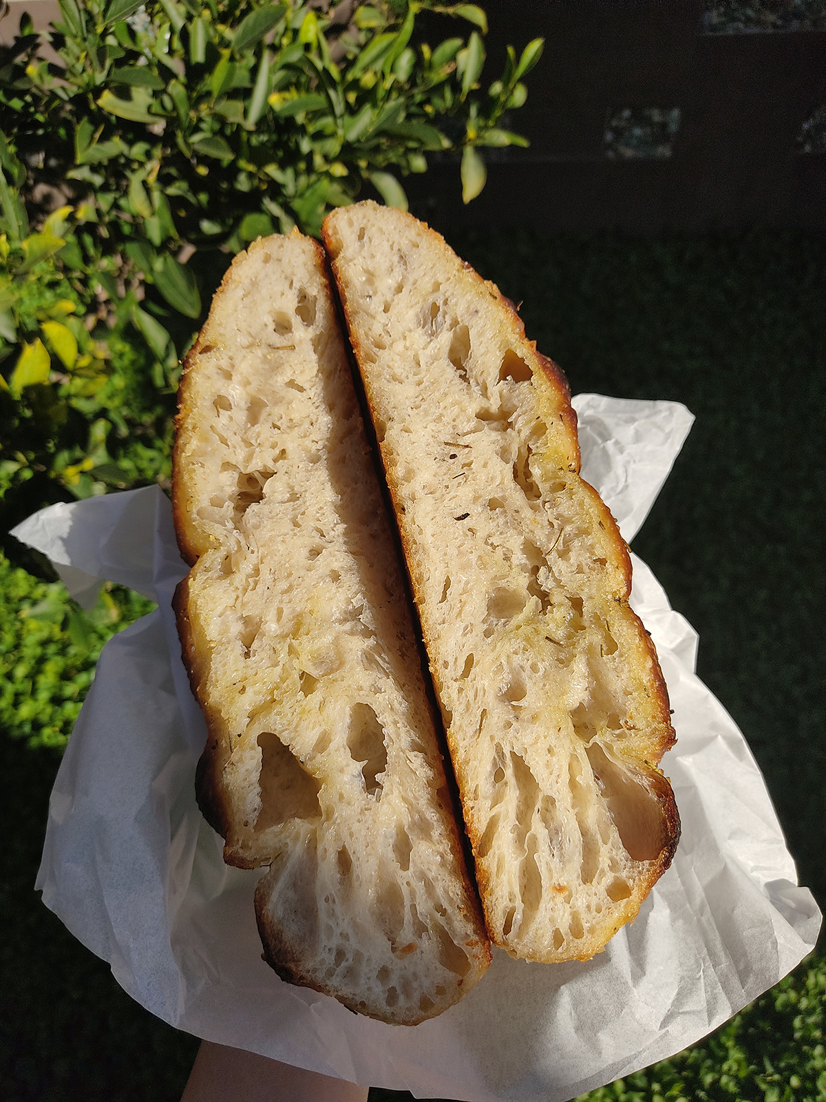 Foccacia ama üzerinde zeytin, domates ya da başka bir ürün yok. Aslında burada “Tuz, Yağ, Asit, Isı” belgeselini yeni izlediğim zamana dönüyoruz. Belgeselde Foccacia’nın orijinal İtalyan tarifinde önemli olan iki malzeme olduğu söyleniyor: Doğal zeytinyağı ve deniz tuzu.